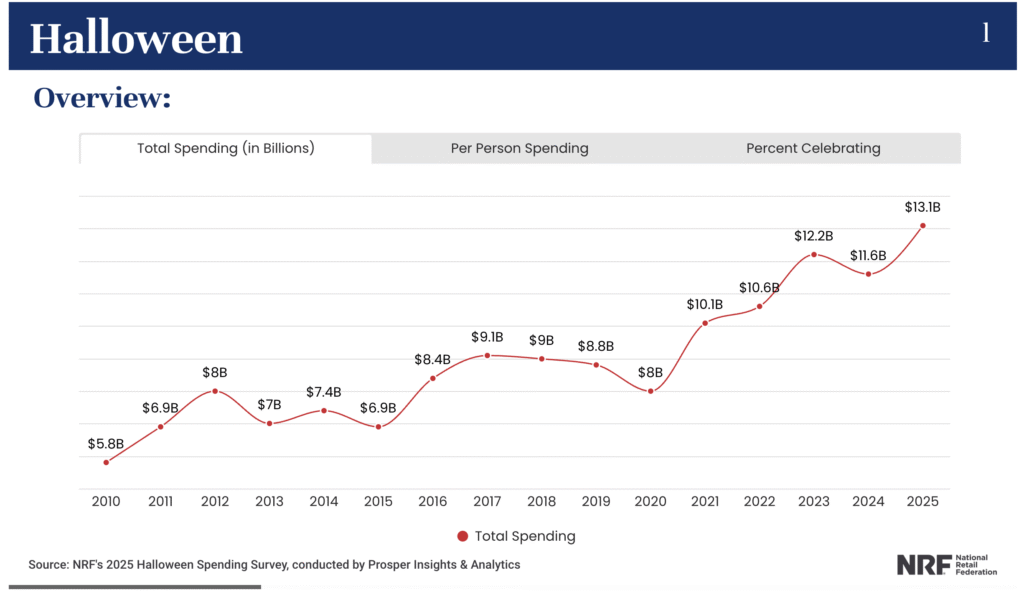 As shown below, Halloween spending in 2025 is expected to reach an all-time high of $13.1 billion. With this spending around Halloween, we must acknowledge our habits when buying our costumes.